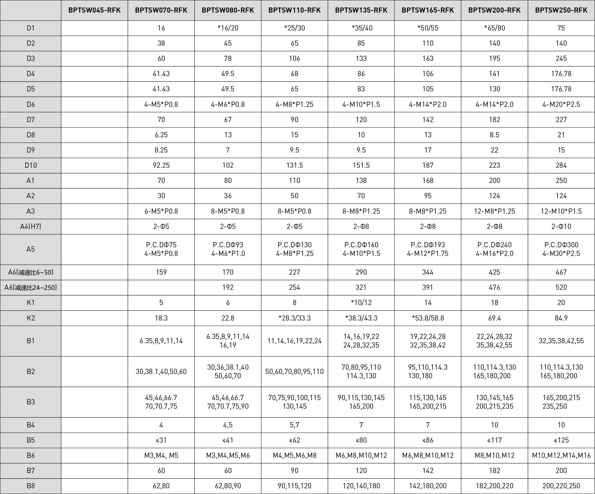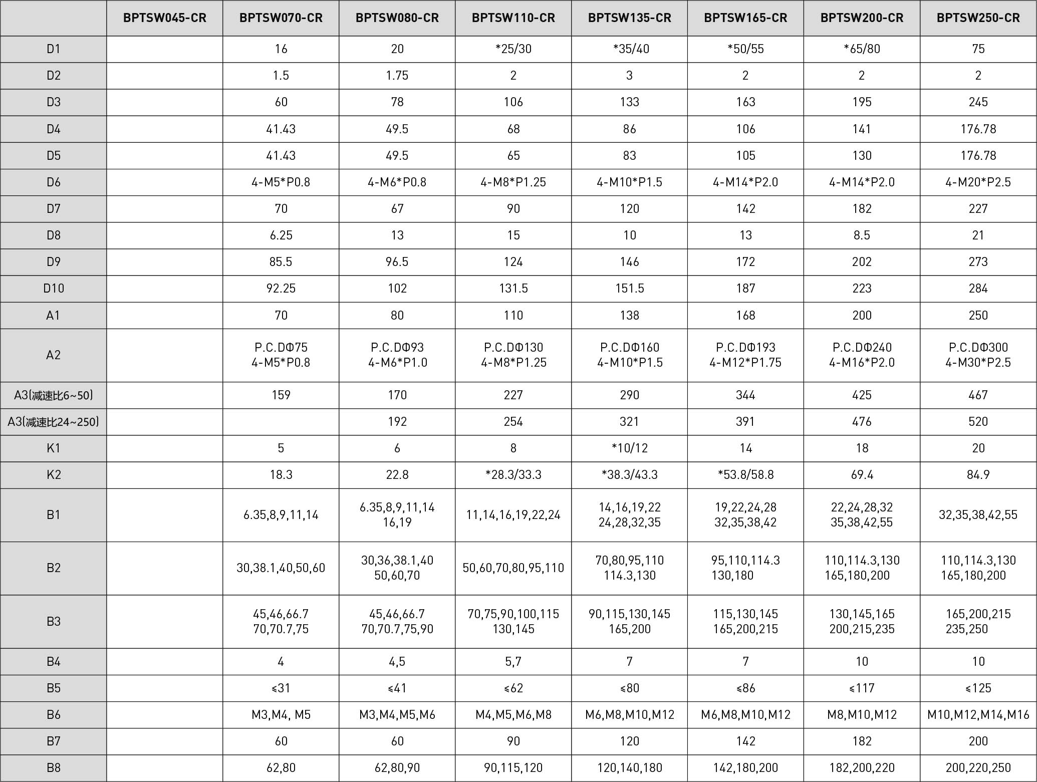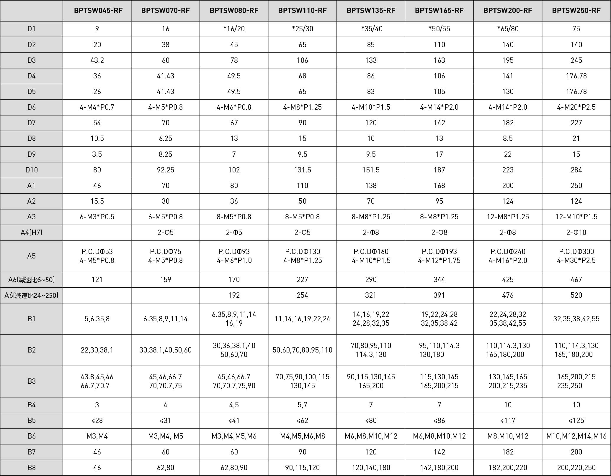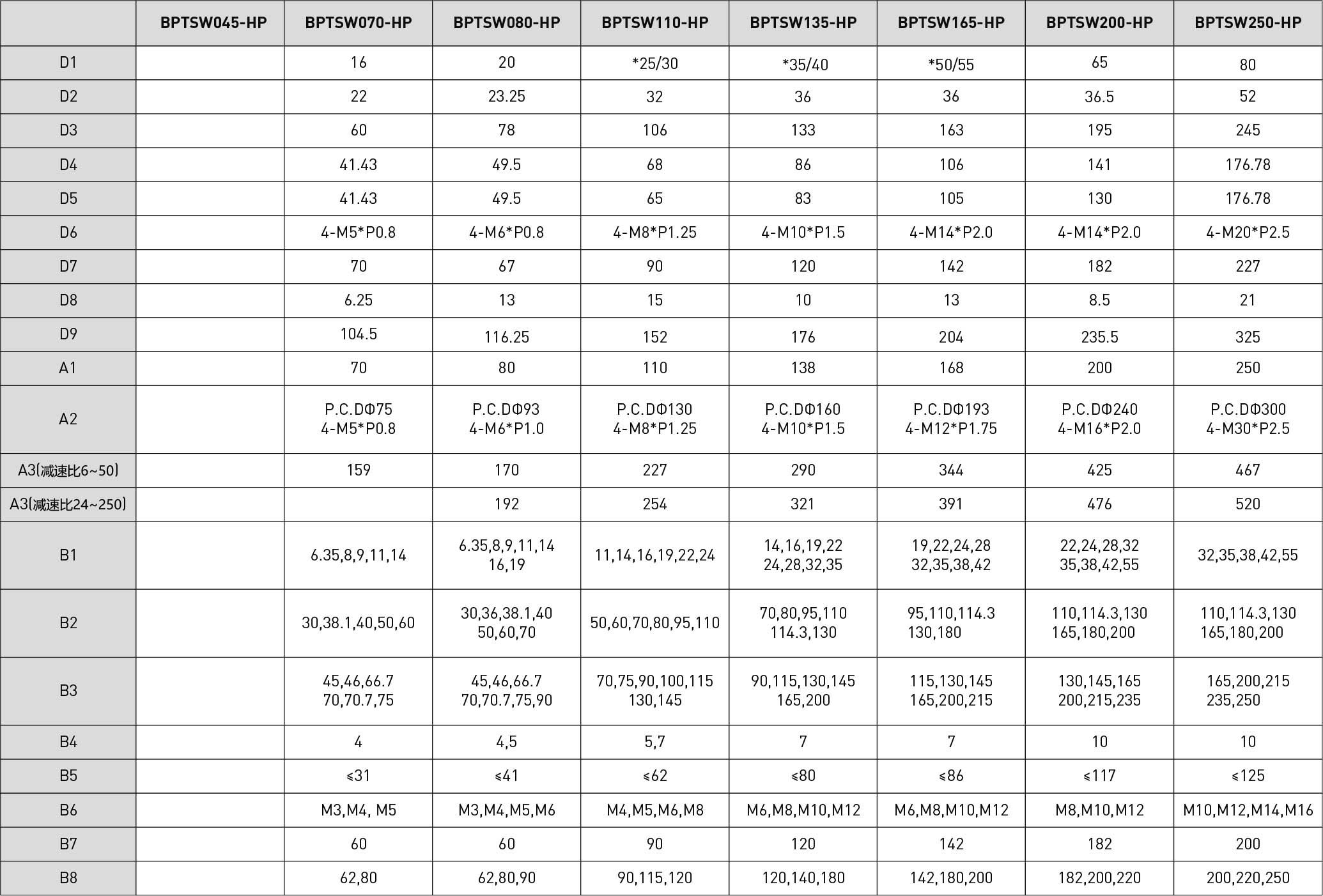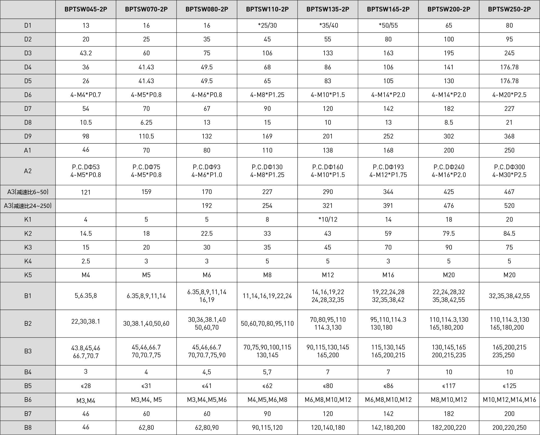 技术参数段数减速比BPTSW045BPTSW070BPTSW080BPTSW110BPTSW135BPTSW165BPTSW200BPTSW250